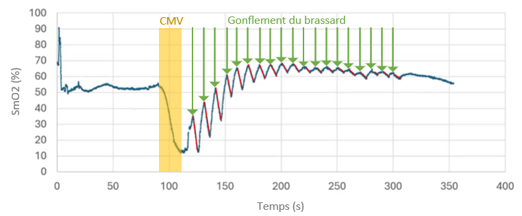 (a) Désaturation de la SmO2 à une Contraction Maximale Volontaire, puis ressaturation avec occlusions rapides.