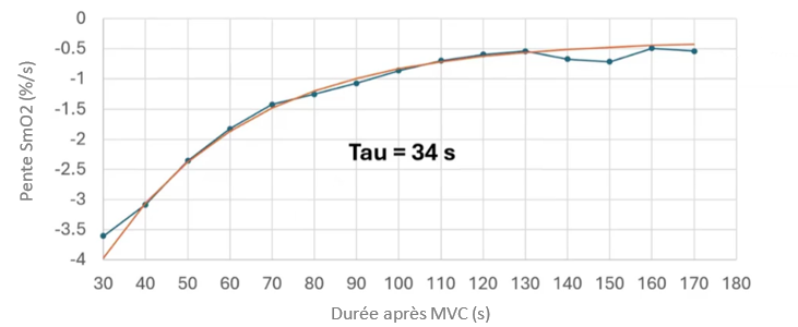 Les désaturations sont plus intenses au début, jusqu’à se stabiliser à la valeur basale. La constante calculée par l’interpolation exponentielle permet de quantifier une récupération en oxygénation rapide pour des athlètes entrainés (10-15s) ou lente (80-100s) pour des sujets présentant des limitations en apport d’O2 ou un disfonctionnement mitochondrial.