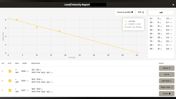 Sur cette partie, la machine permettra d’optimiser l’utilisation du profil charge / vitesse en individualisant avec grande précision la résistance permettant d’atteindre la vitesse spécifique (Vdec) (par exemple 10 %, 25 %, 50 %), et en indiquant la charge exacte dont chaque athlète a besoin pour atteindre cette Vdec.