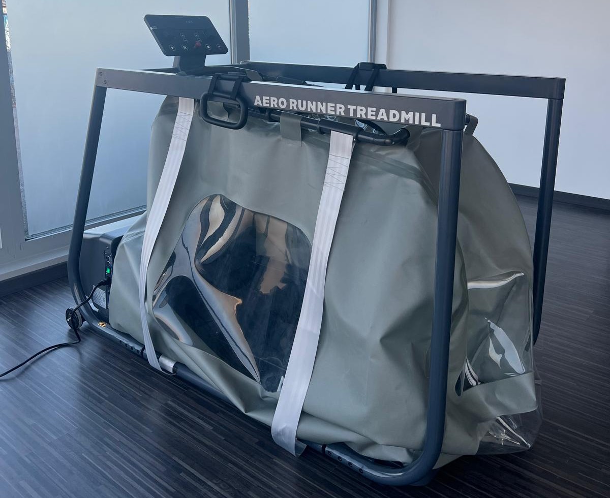 Le fonctionnement des tapis anti gravité repose sur une chambre hermétique intégrée au tapis roulant, dans laquelle l’utilisateur est connecté via un short technique zippé. Une fois la chambre fermée, un système de pression d’air contrôlée génère une force verticale ascendante, réduisant le poids effectif supporté par les membres inférieurs. Cette décharge est réglable de manière très fine, généralement par incréments de 1 %, permettant d’ajuster précisément la charge entre 20 et 80 % du poids corporel réel, dans le cas de notre tapis AeroRunner jusqu’à 85%.