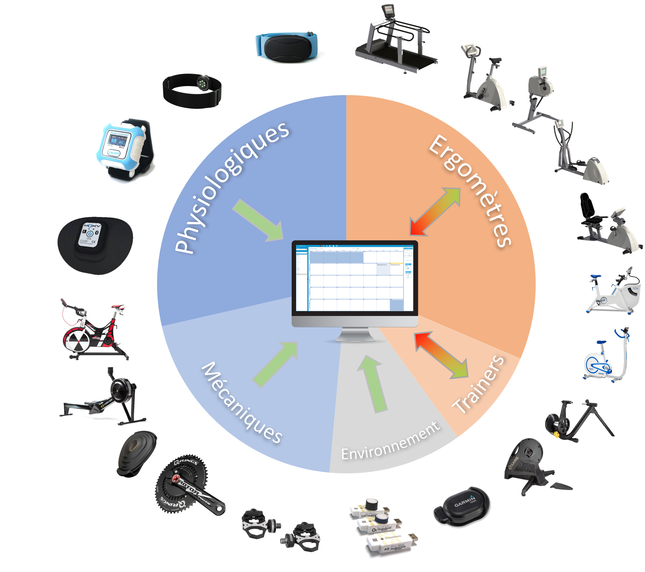 Les périphériques de mesure physiologiques ou mécaniques communicant sur les standards ANT+ ou Bluetooth LE sont intégrables directement dans la plateforme. D'autres périphériques comme les ergomètres et les caateurs environnementaux nécessitent une connexion filaire USB ou série. Le logiciel reçoit les données de ces capteurs directement et en temps réel.
