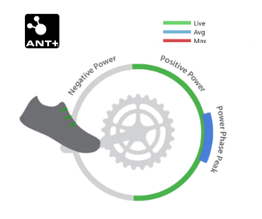 Phase de poussée : visualiser en temps réel sur un graphique horaire la phase de pousser effectuée par chaque jambe. Vous pouvez également moyenner ces données sur plusieurs cycles de pédalage et déterminer le pic de la phase de puissance, c’est à dire la partie ou se concentre le plus la production de puissance sur la poussée.